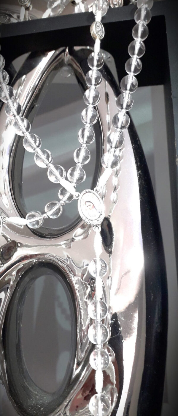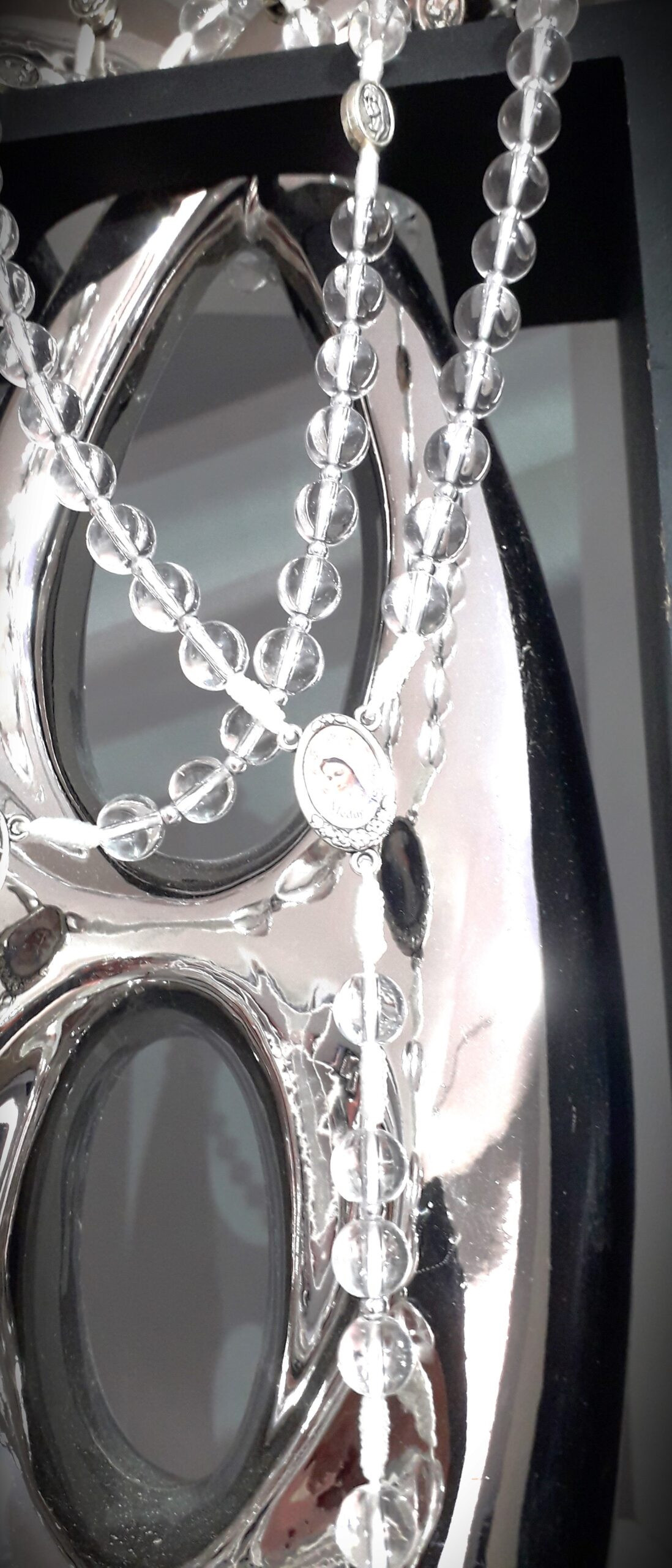 Handmade Rosary made of transparent glass and Silver-plated beads with silk thread.